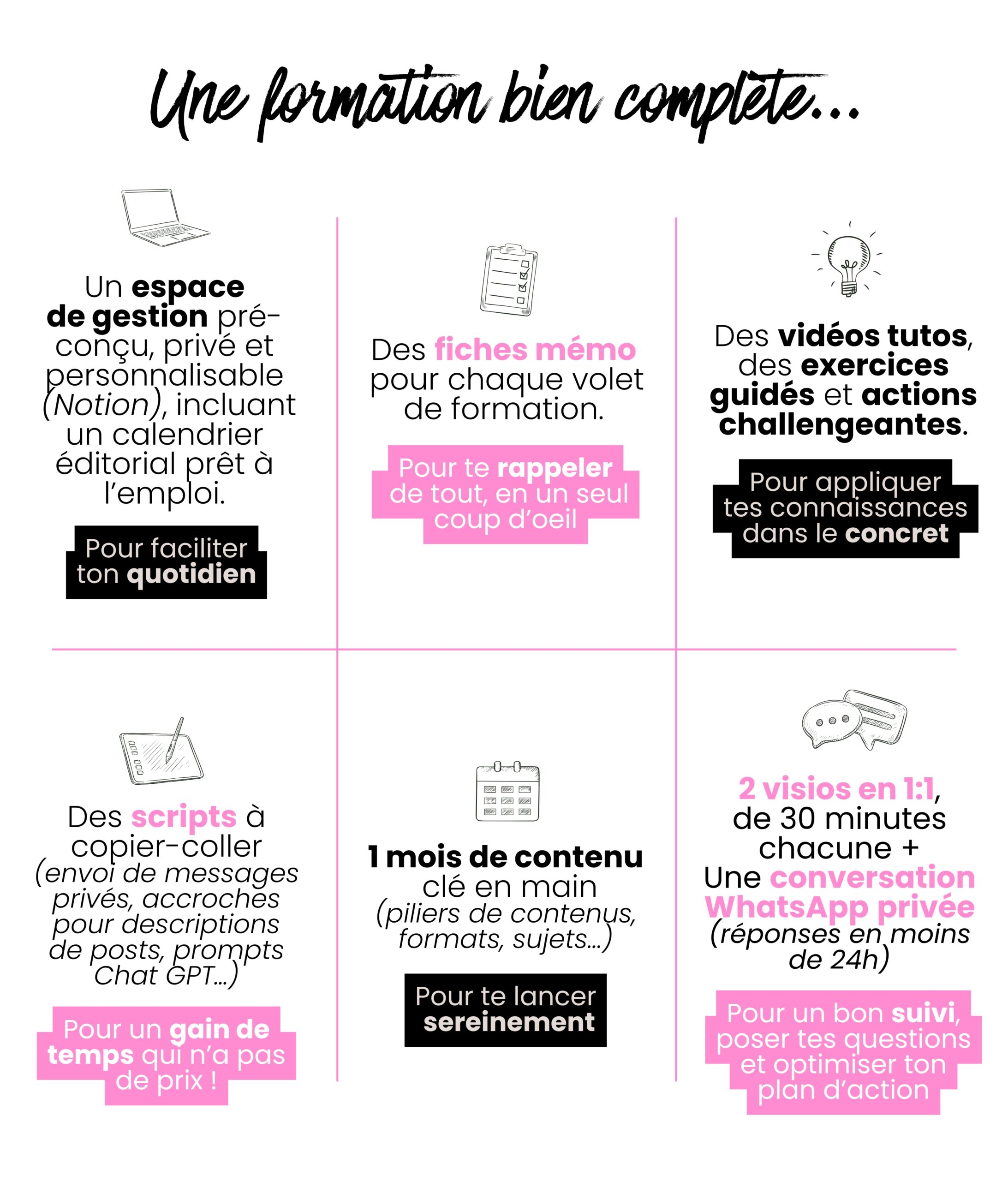 ☑️ Création de contenu à forte valeur ajoutée : trouver des idées de contenus, quels formats, quel rythme, tendances, fonctionnalités pour booster ta visibilité, prendre des photos de qualité…